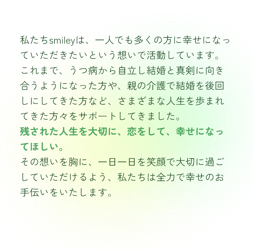 心に迷いや不安がある時、その想いを受け止めながら前向きな気持ちで進む力を育み、成婚に向けた道のりを全力でサポートいたします。